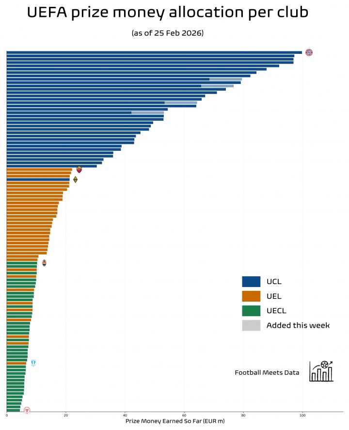 2月25日消息:专业数据媒体Football Meets Data对当前三级别欧战奖金进行了统计。其中,拜仁最多,为9980万欧元,而欧联杯最多的罗马,仅比欧冠最少的凯拉特阿拉木图多了90万欧元。